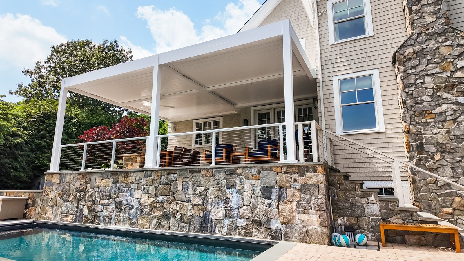 Motorized Pergola Poolside Terrace Westport Connecticut About Project Project Type: Outdoor Living / Smart Pergola Installation Client Goal: Year-round shade, luxury outdoor ambiance, seamless integration