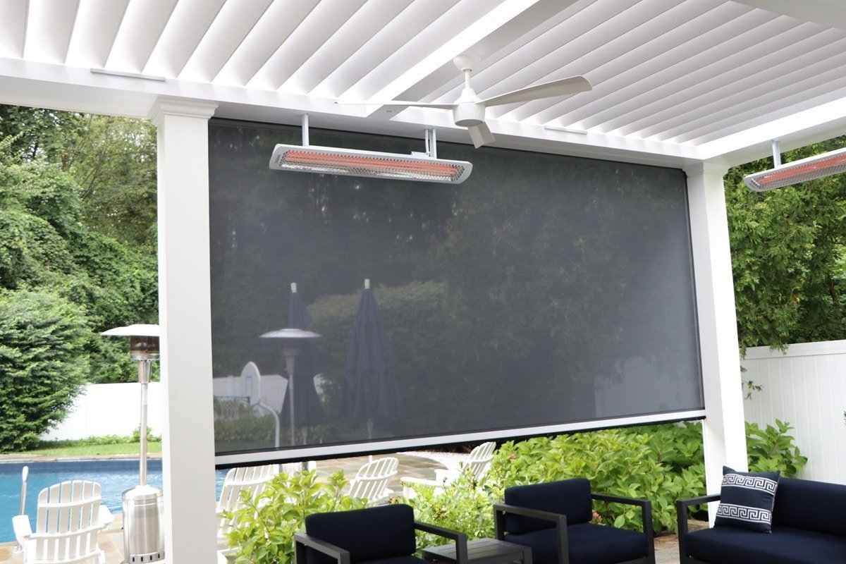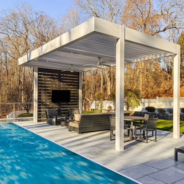 Poolside Motorized Pergola Greenwich CT About Project Objectives and features: They wanted a poolside motorized pergola with a built-in privacy wall and T.V. wall mount.