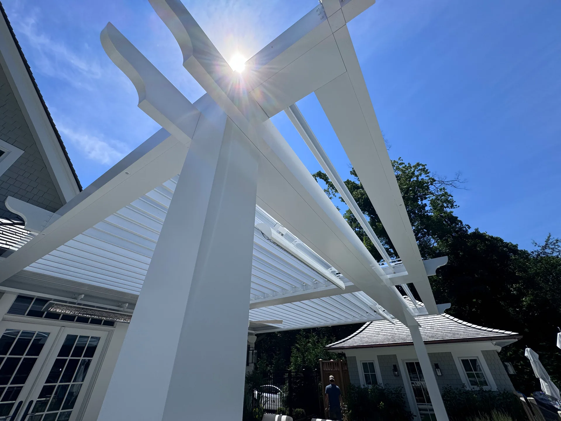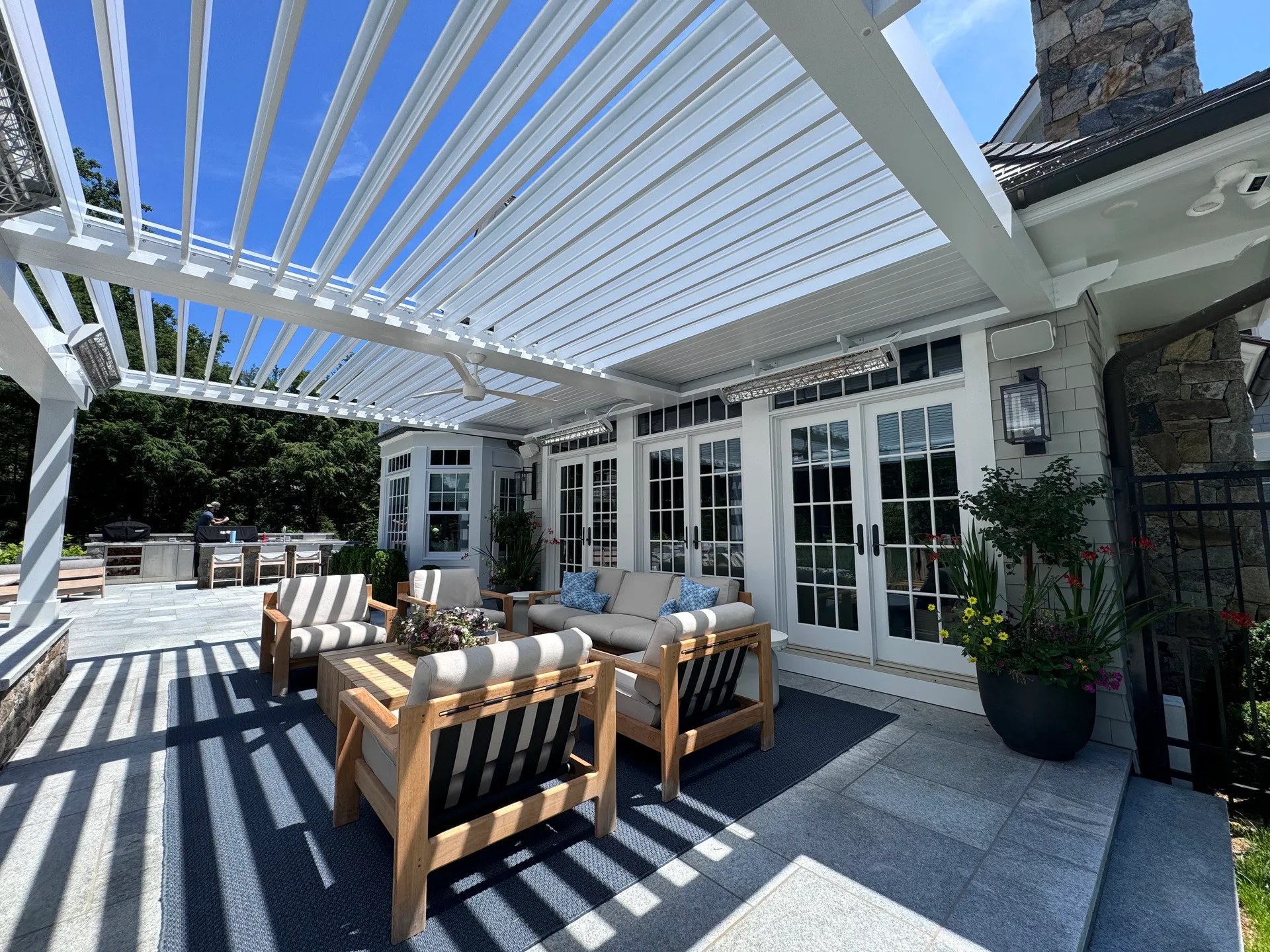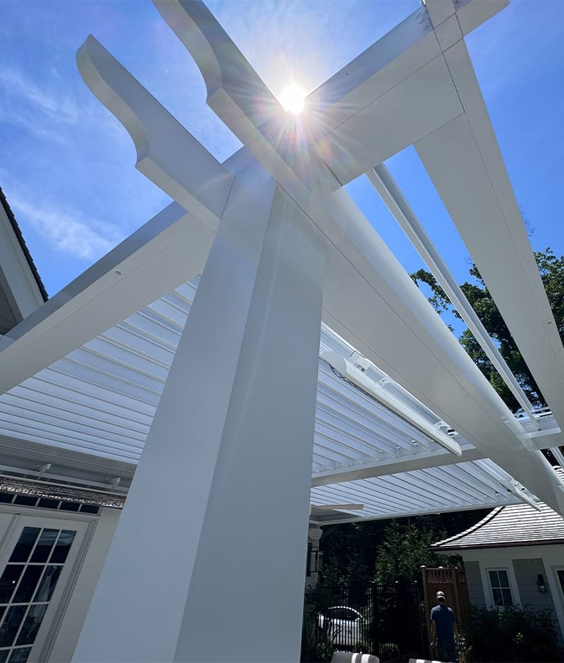 We installed a classic style louvered roof system in riverside Connecticut that added the perfect charm to the client’s home and complemented the house perfectly. The client also installed bromic 6000-watt heaters for them to enjoy in the colder months. They love the rain protection and shade control the system provides and the expertise in the craftsmanship we provide.