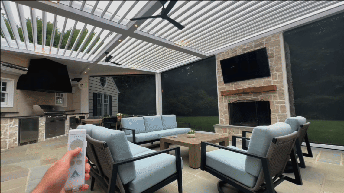 The result is a refined transitional-style outdoor living space that offers both elegance and functionality. The pergola’s concealed motorized shades, automated climate response, and sophisticated trim detailing create an environment perfect for relaxing or entertaining — all with luxury at the touch of a button.