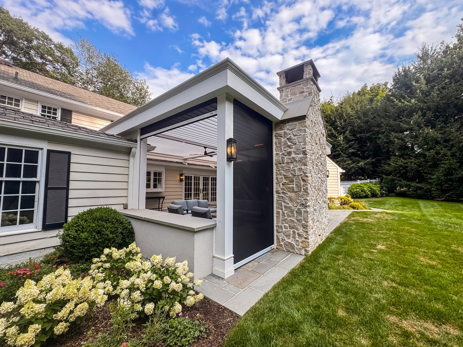 Client Goal: Create a timeless, transitional-style outdoor living space with a refined trim package and discreet motorized shade integration to blend luxury, comfort, and architectural elegance.