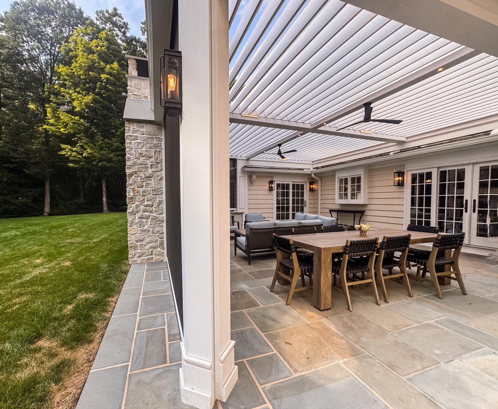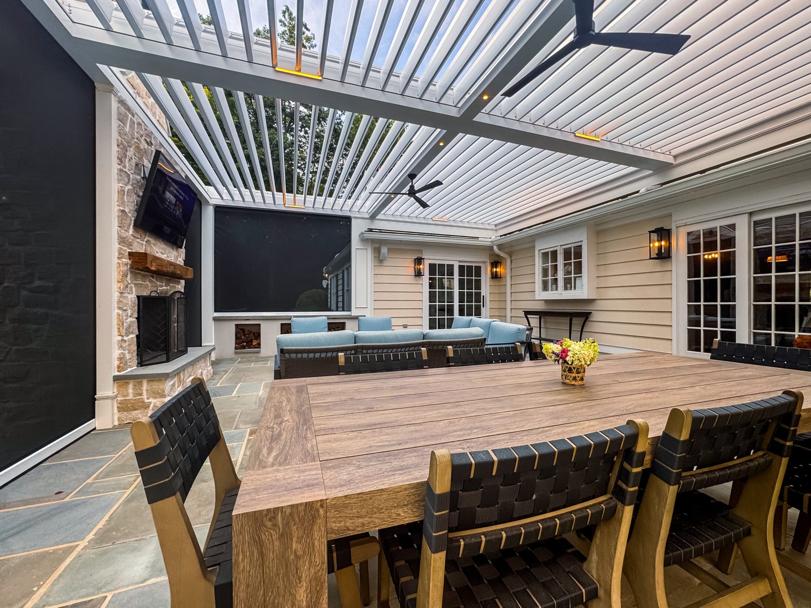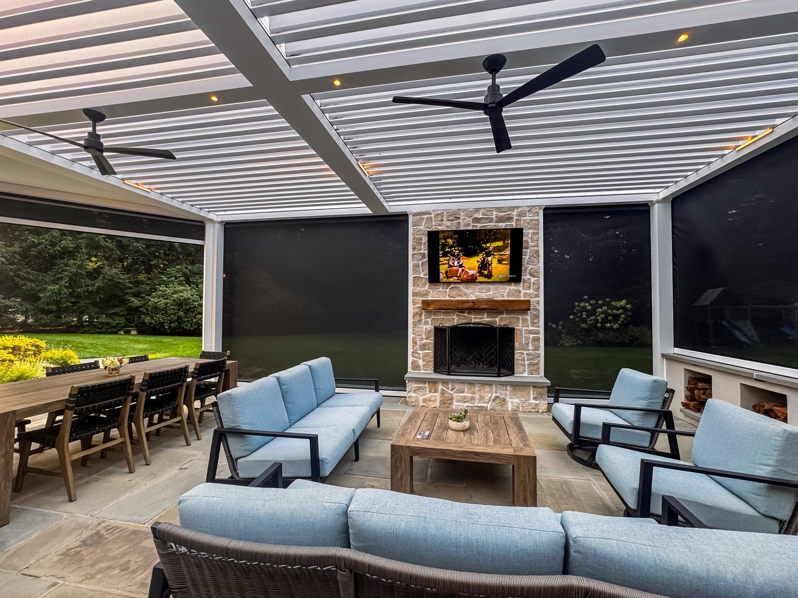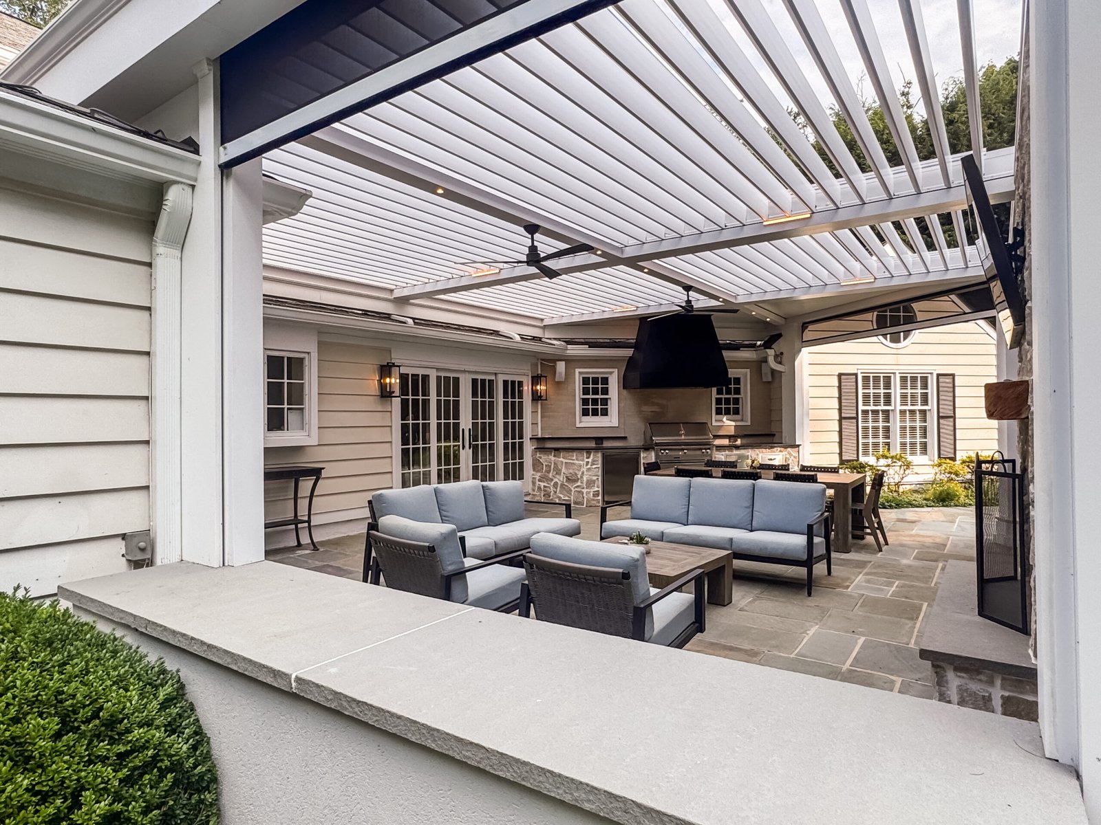 The result is a refined transitional-style outdoor living space that offers both elegance and functionality. The pergola’s concealed motorized shades, automated climate response, and sophisticated trim detailing create an environment perfect for relaxing or entertaining — all with luxury at the touch of a button.