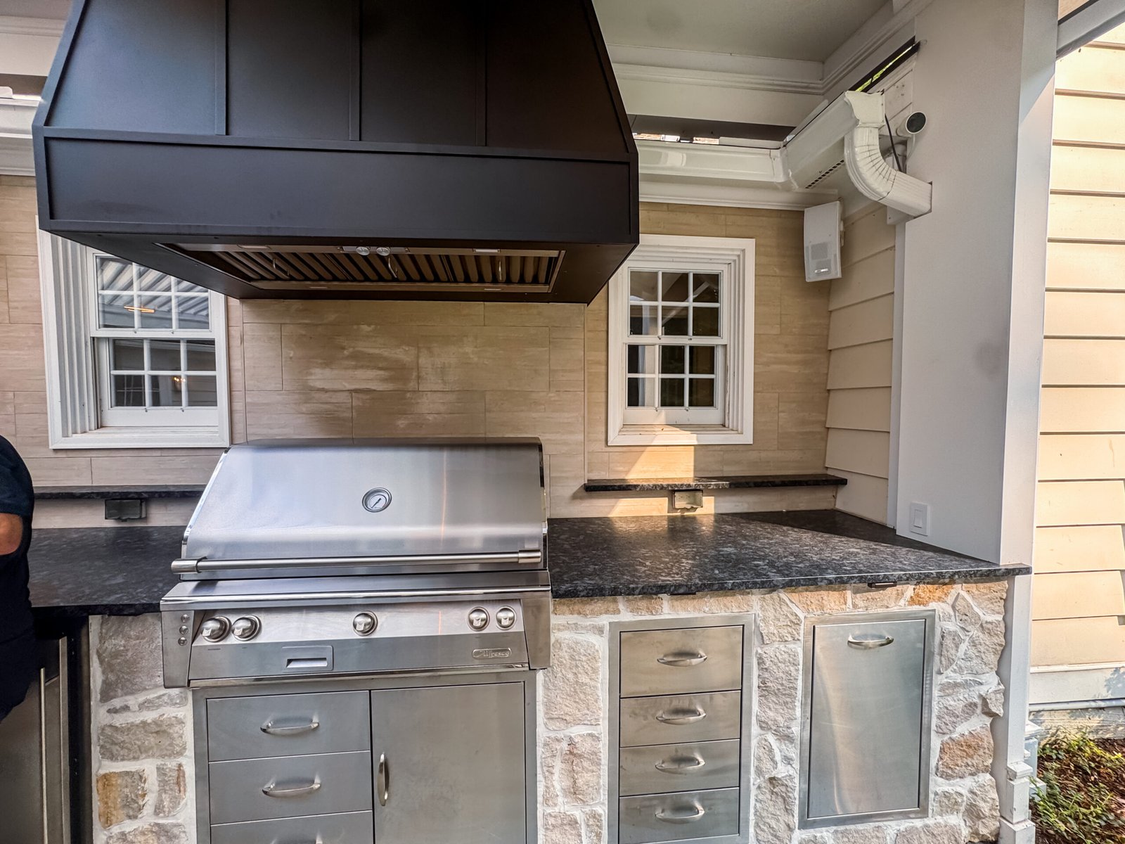 At the heart of the installation is a motorized pergola system with concealed motorized shades, engineered to provide effortless sun control while maintaining a clean, sophisticated look. The homeowner envisioned an outdoor retreat that combined luxury, comfort, and timeless design, and this project delivered exactly that.