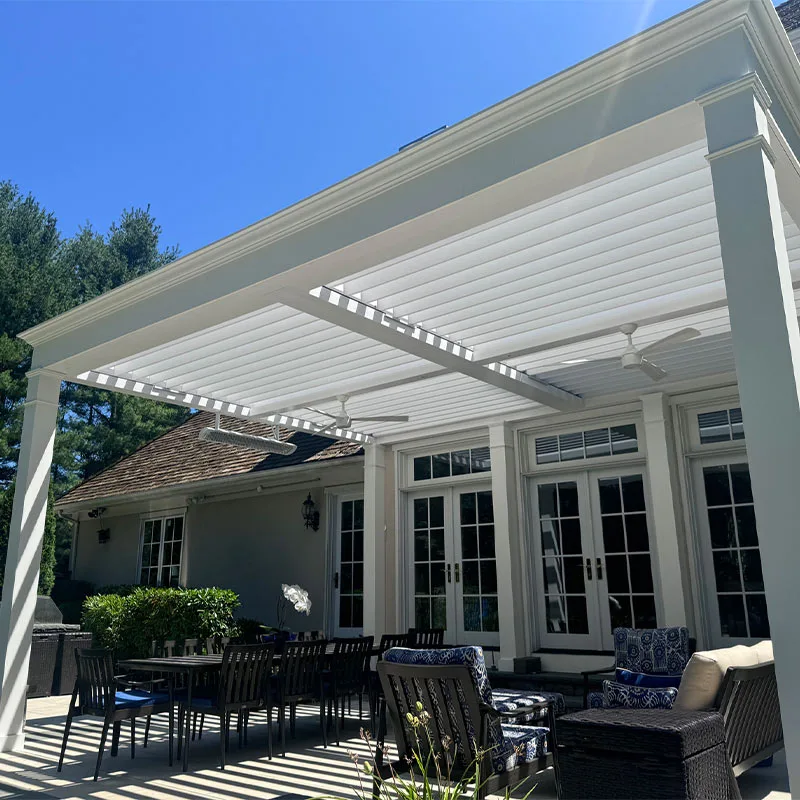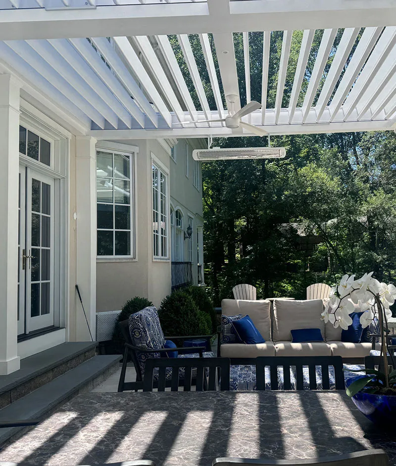 The client needed a louvered roof system for there patio that had no escape from the sun. they wanted a high quality product and the highest end service and engineering. Thats where breslow stepped in by installing a custom transitional style motorized louvered roof system.