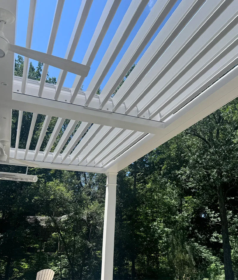 The client wanted a quality pergola that wouldn’t look like a cheap add-on shade solution, they also wanted something highly functional and quality designed and manufactured. our transitional style louvered roof system did that as well with the custom Azek we wrapped around the system giving the pergola a transitional look that matched the client’s home to perfection.