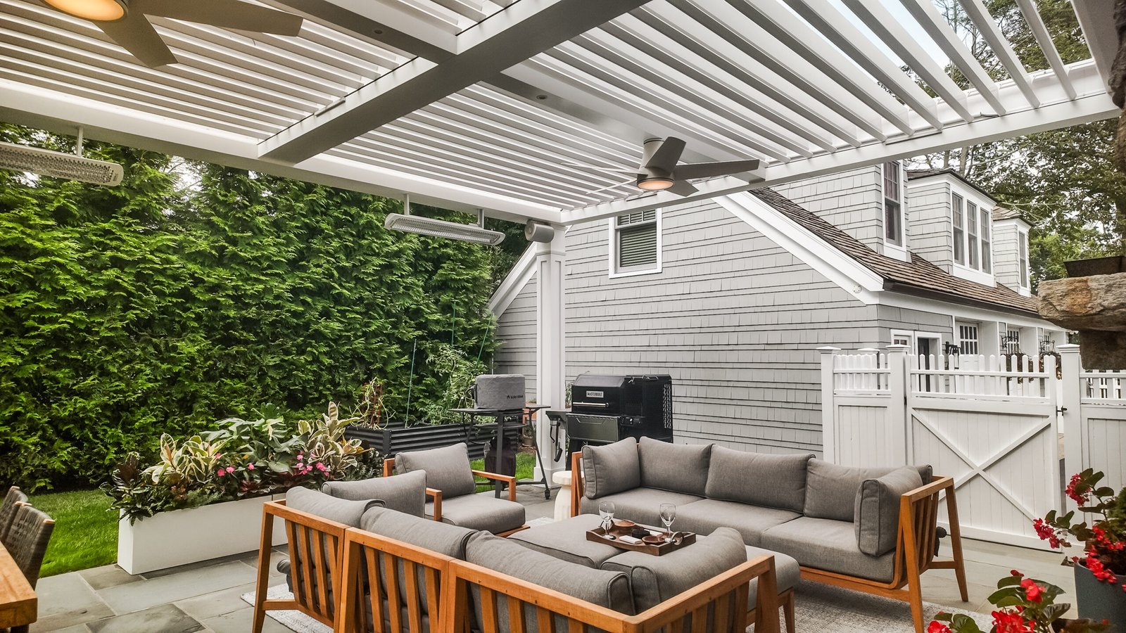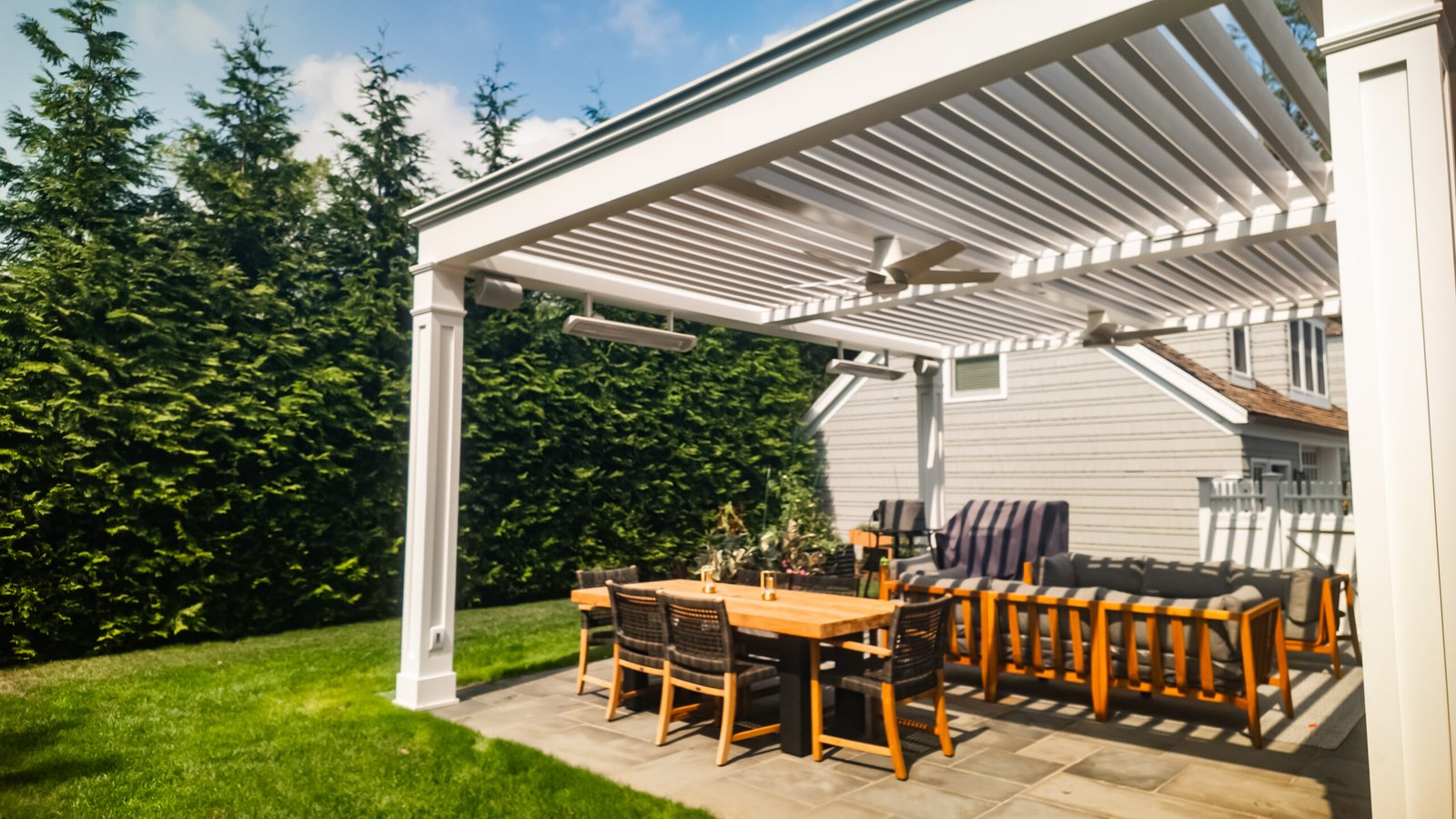 Client Goal: CCreate a transitional-style outdoor living space with refined architectural detailing and an integrated AZEK packout that seamlessly connects the pergola to the home.