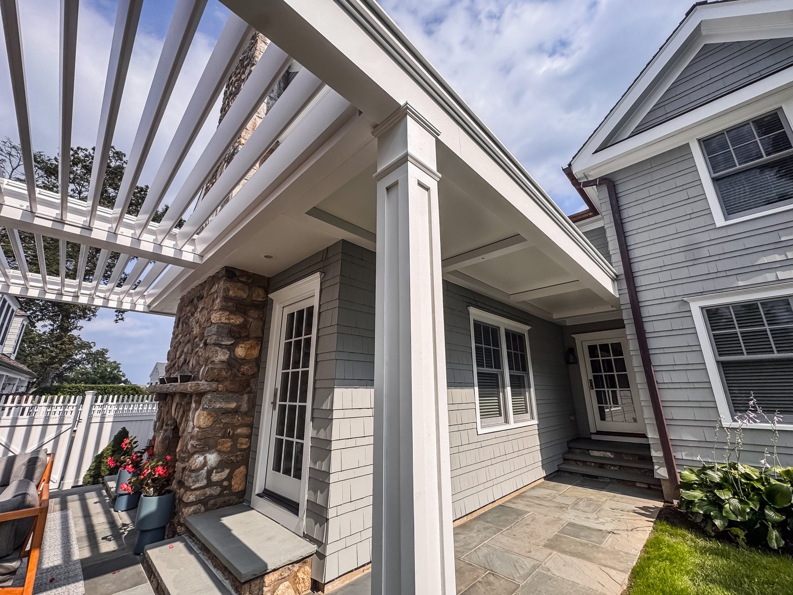 This custom installation in New Canaan, CT elevated the client’s outdoor living experience by introducing a transitional-style pergola enhanced with a custom trim package and a seamless AZEK packout connection to the house.
