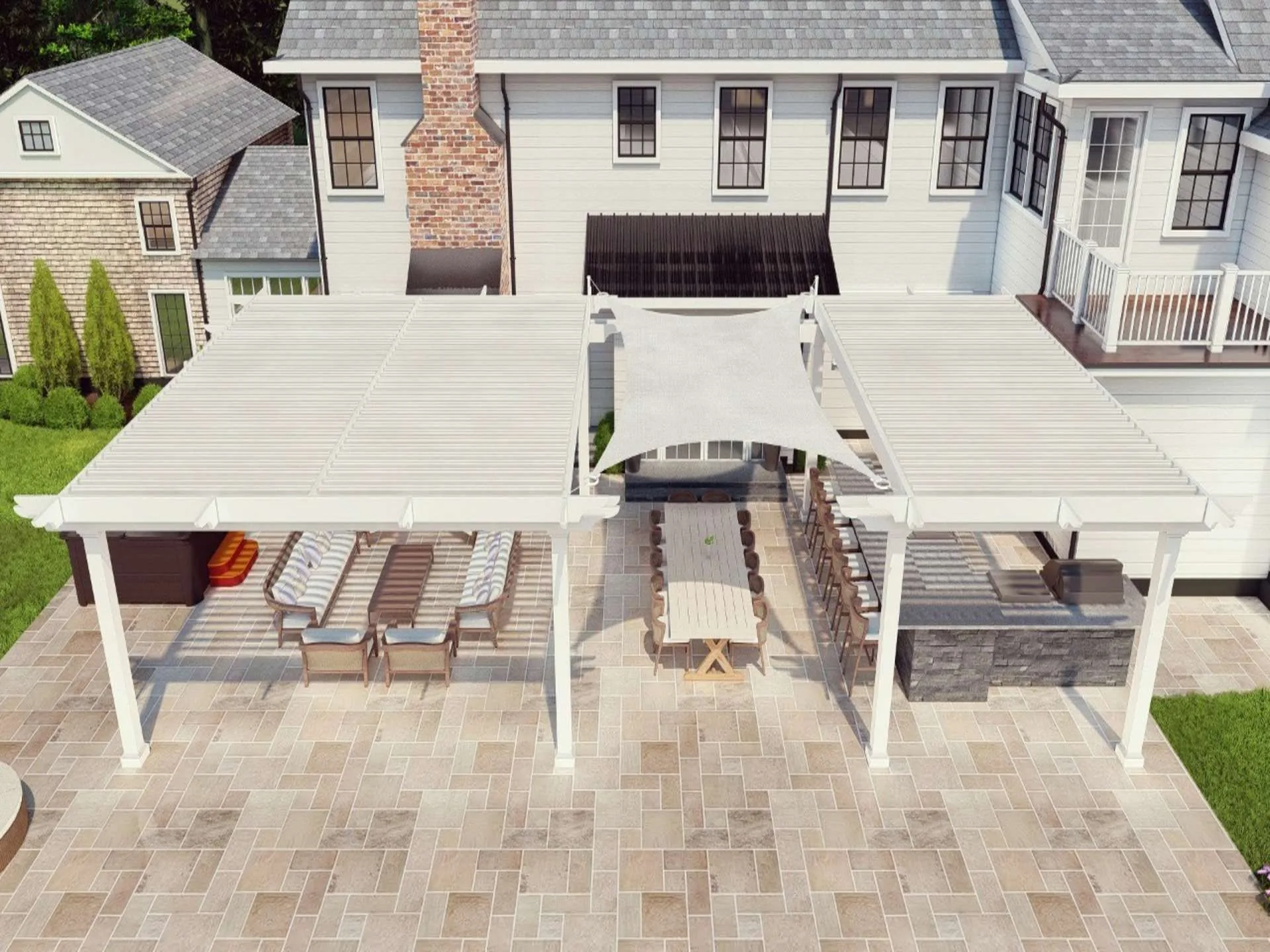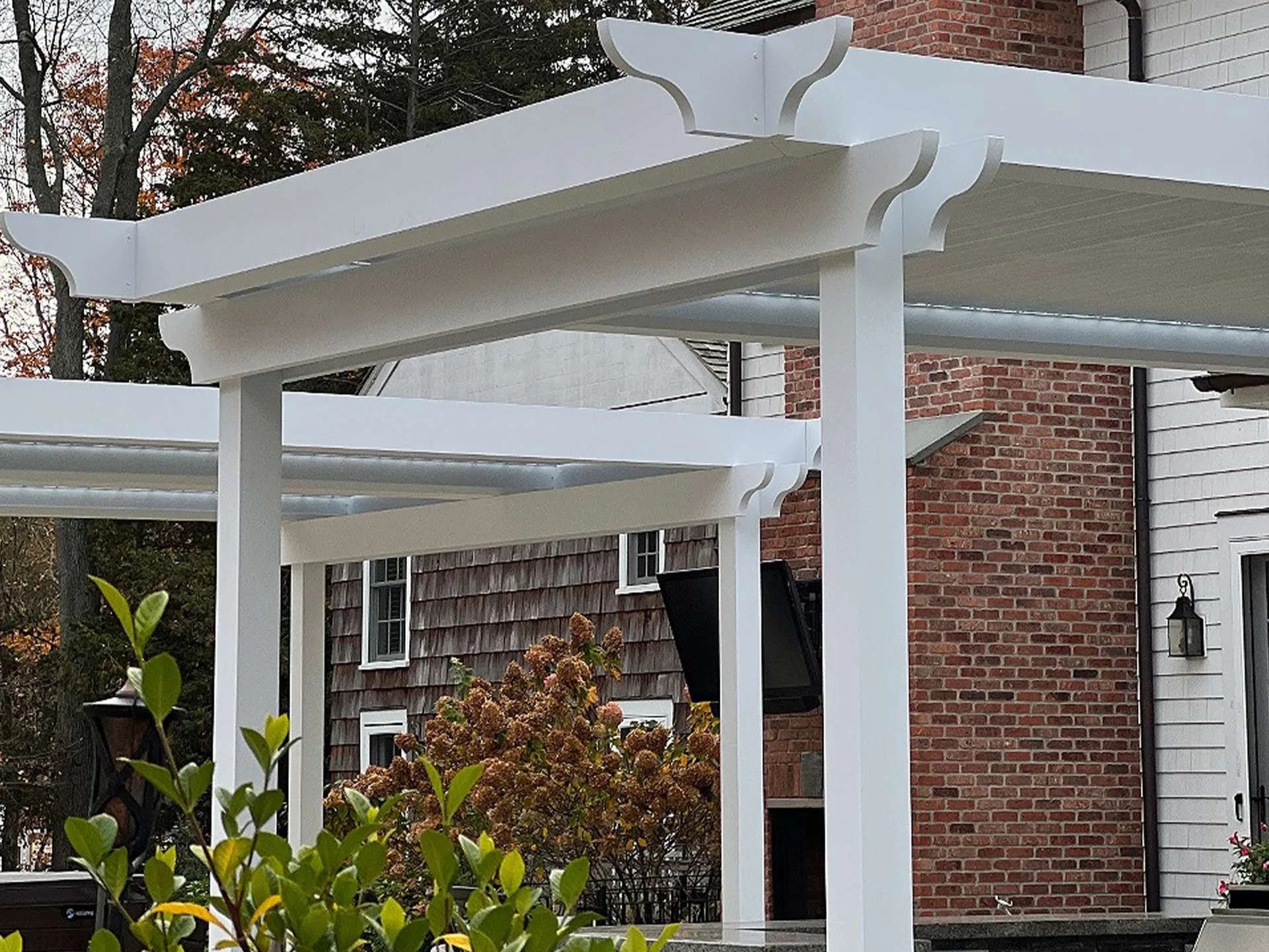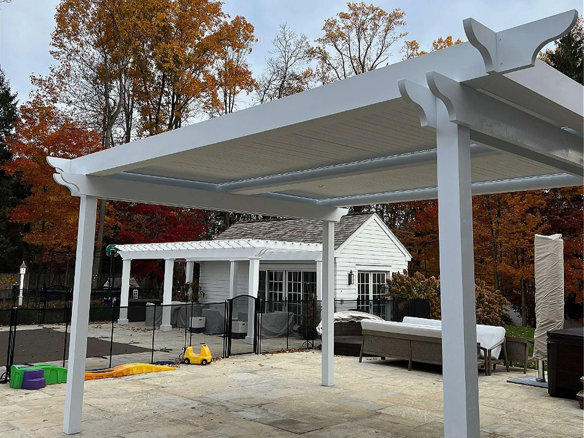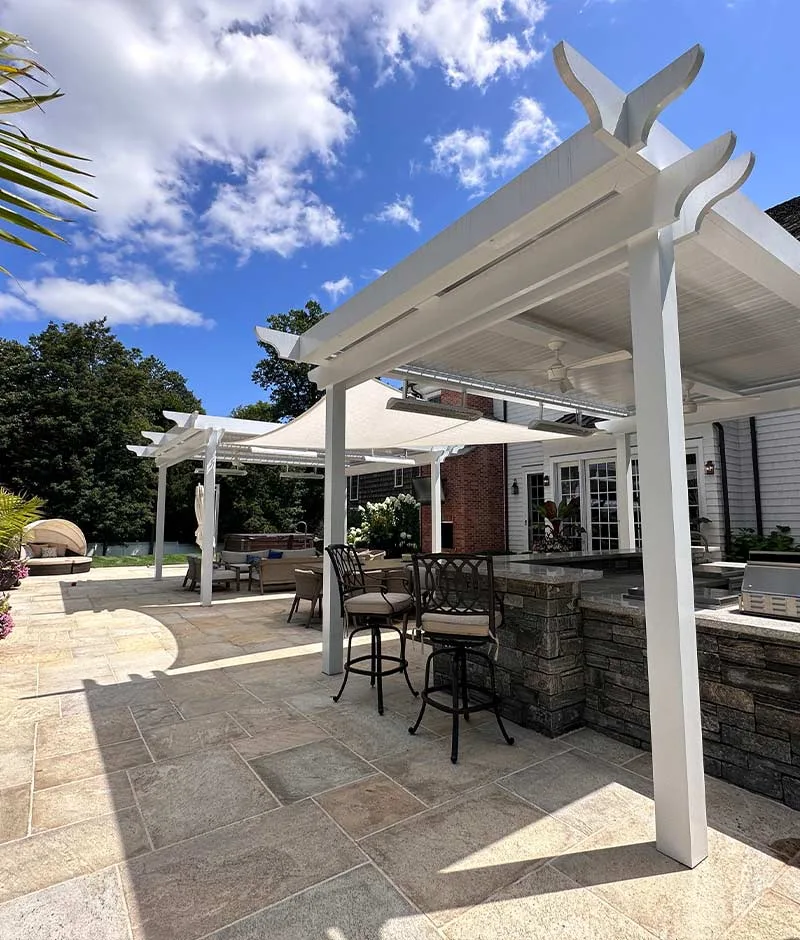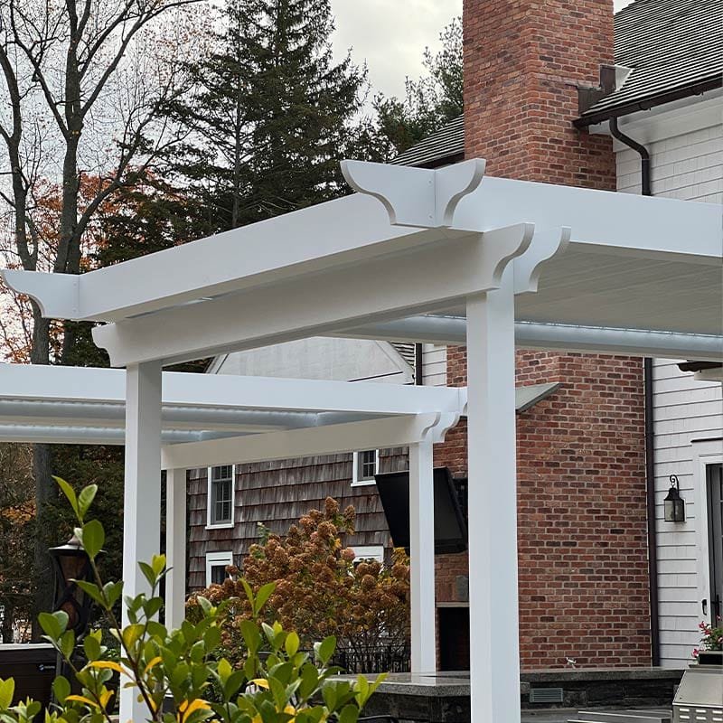 The client envisioned a pergola system that would provide both shade and sunlight at the same time, but also wanted the project to truly blend in with the aesthetics of the home. that is why we installed custom classic style end caps to give the pergola a timeless look while still coupling it with modern functionality
